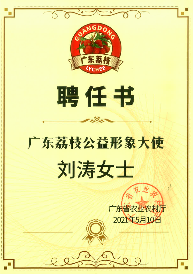 在纵向延伸上,刘涛的身份也在复杂化,在不同的场景下衍生出新的信用背书,比如受聘成为广东荔枝公益形象大使。