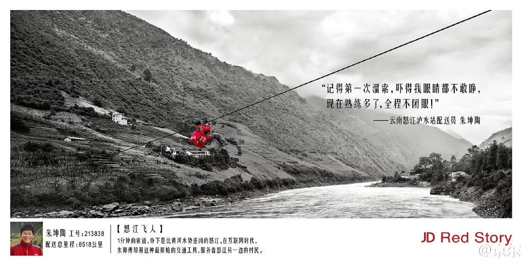 海报整体呈黑白色,但画面中有一抹亮眼的红,那就是京东的配送员们。海报将京东配送员的日常工作呈现了出来,他们或爬山、或涉水、或等待。不管带着多沉重的包裹,要去多远的地方,走多坎坷的路,他们都会承诺抵达。