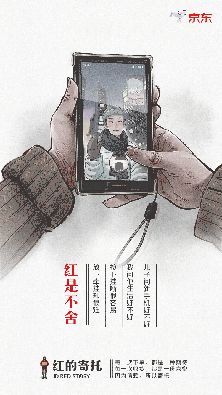 广告中没有过度煽情,而是娓娓道来。最后再自然地引到京东品牌本身,让代表温暖、寄托的红色与京东形成深深地联系,在消费者心中建立深刻的印象。