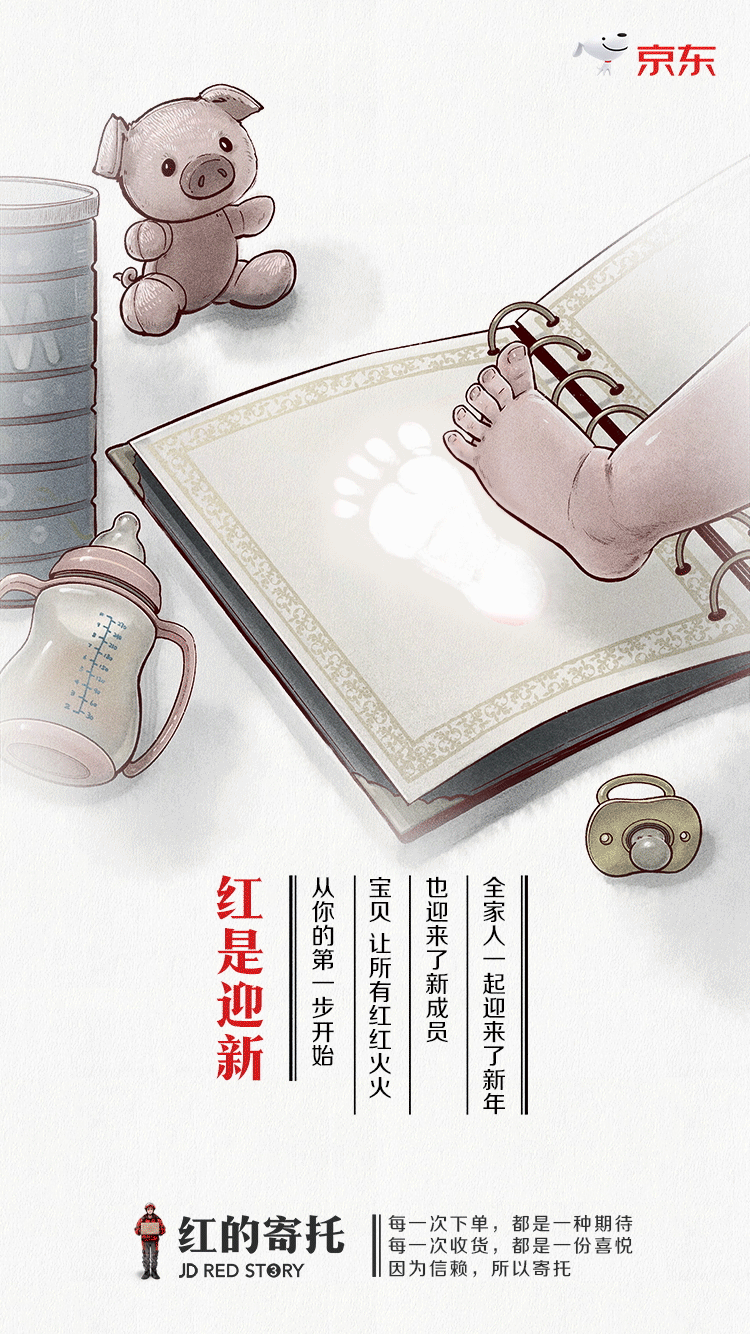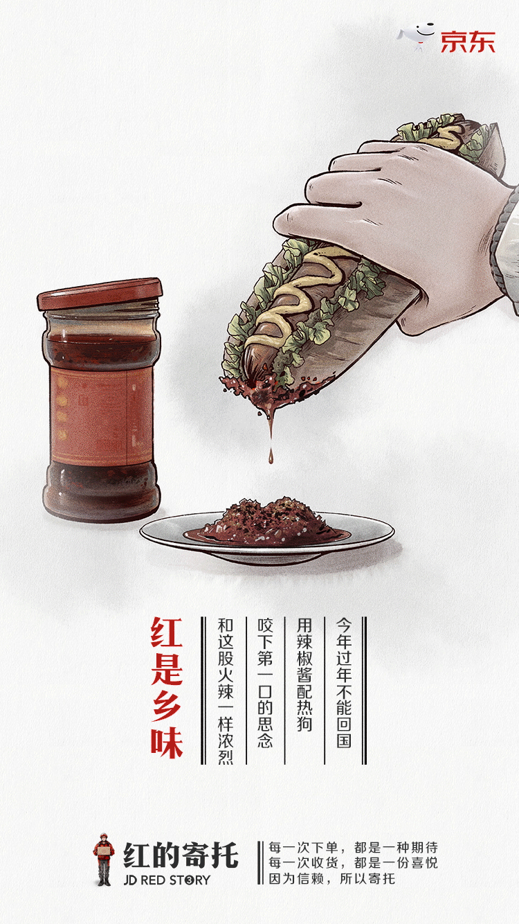 但能将红色与情感联系来表达品牌价值观从而建立品牌形象的广告并不多,所以笔者找到了一个不错的作品供大家参考学习:京东的系列广告——《红的故事》。