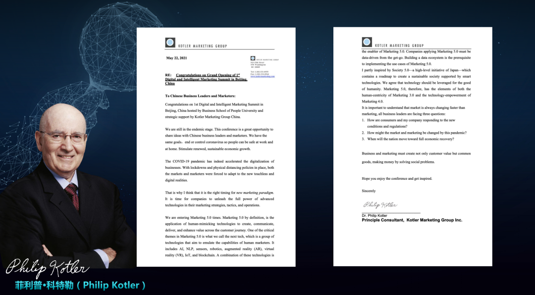 曹虎:非常荣幸来到全球数智峰会的现场,刚才听嘉宾的演讲,我的收获特别大,菲利普·科特勒先生在美国但也非常关注这次峰会,他专门写了一封贺信,我代表菲利普·科特勒先生来解读一下这封信,我把它翻译成中文给大家分享。