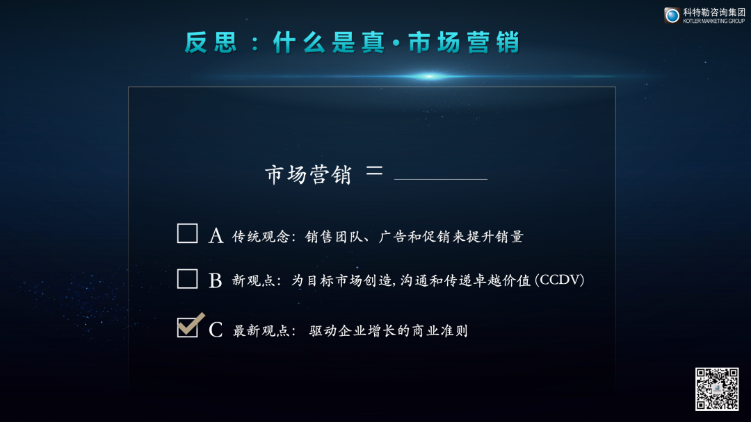 什么是真正的营销?传统观点认为营销是销售团队、广告加媒体促销来提升销量。更新鲜的观点是应该围绕着目标顾客来创造交付传递卓越价值。但他认为营销在现今应当是围绕着顾客价值,驱动企业良性增长和内生性增长的一系列商业准则,这是菲利普·科特勒先生对营销最新的定义。