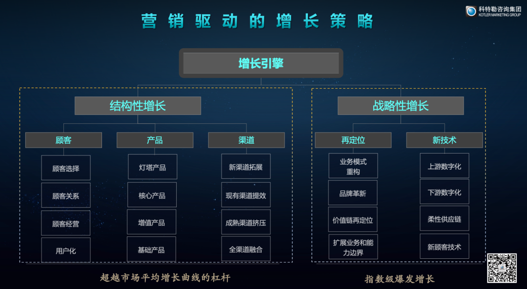 在这样的定义下,如果把企业的整个目标围绕着创造顾客围绕着良性增长来进行重构,在这样重构大格局之下,我们可以实现结构性增长和战略性增长。在结构性增长和战略性增长中,产品、顾客、渠道、品牌,技术都能够驱动企业实现良性增长。