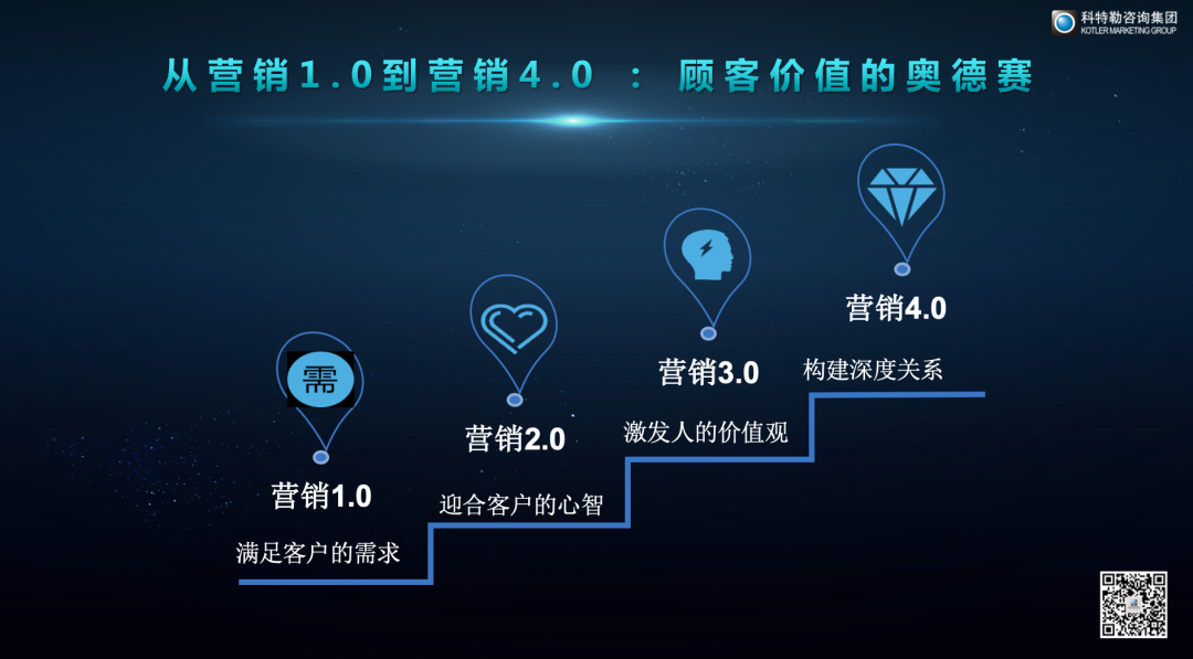 4.0是在移动互联网时代有了连续追踪顾客并且和顾客交流的平台,从而构建深度的顾客价值。这是营销的1.0-4.0,它们反映了整个商业界企业价值的迁移。