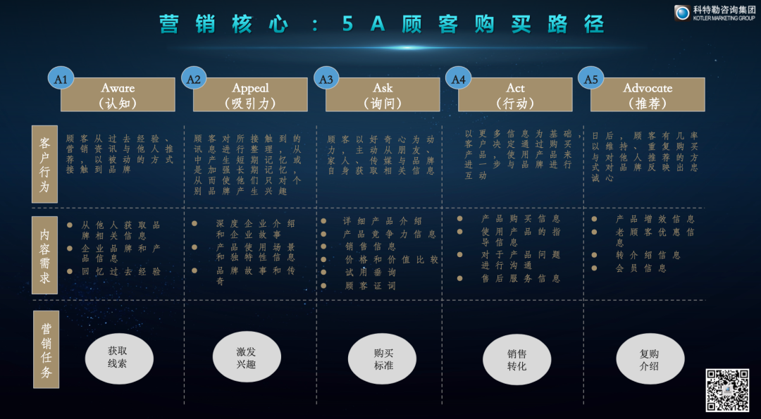 5A模型应用在了汽车行业,获得了非常好的效果。在营销5.0的时代,由于有了营销技术,可以实现线上线下的沟通,用私域等方式来进行综合营销,形成顾客视角。有了这些顾客购买路径可以指导制定更有效的营销策略和数字化路径。用营销5.0概念应用数字化去构建关于顾客全旅程的数字化平台追踪和认知服务。