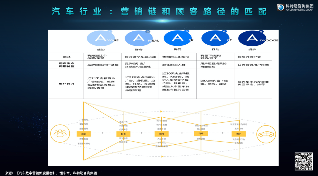 今天5A模型已经大量地应用在了各个行业中,特别是高客单价行业中,比如金融、母婴产品,汽车等。在汽车行业中,顾客是经历一个非常完整的详细的考虑过程,整个决策过程和每个阶段的转化率就呈现了非常独特的格局。