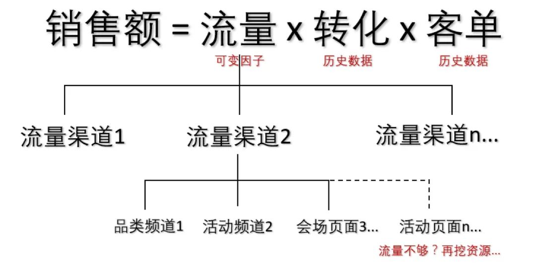 在电商场景下,生意目标多指销售额目标。从过往经验看,转化率与客单价这两个指标,在成熟品类的生态下,基本可参考历史数据,小幅度调整即为合理。有最大可讨论空间的是流量(traffic),它决定整个活动的规模: