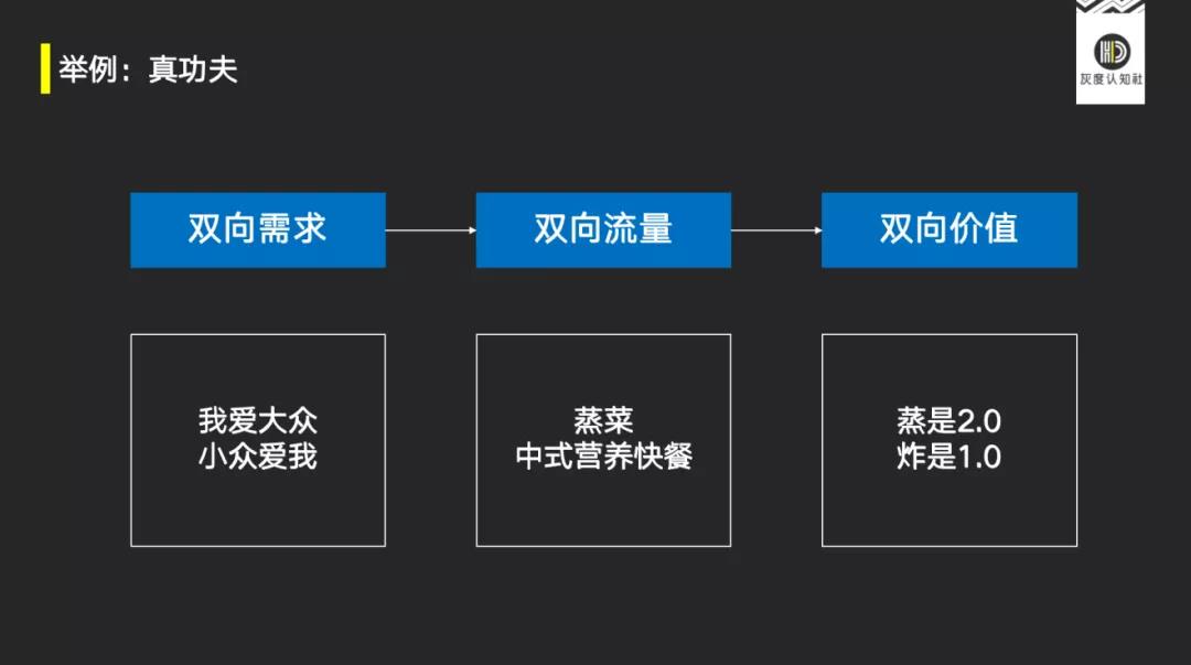 到了这一步也还是不行,中式营养快餐还是不够普及,所以市场份额和心智份额都不大,怎么办?这时我们到双向价值里面去找。