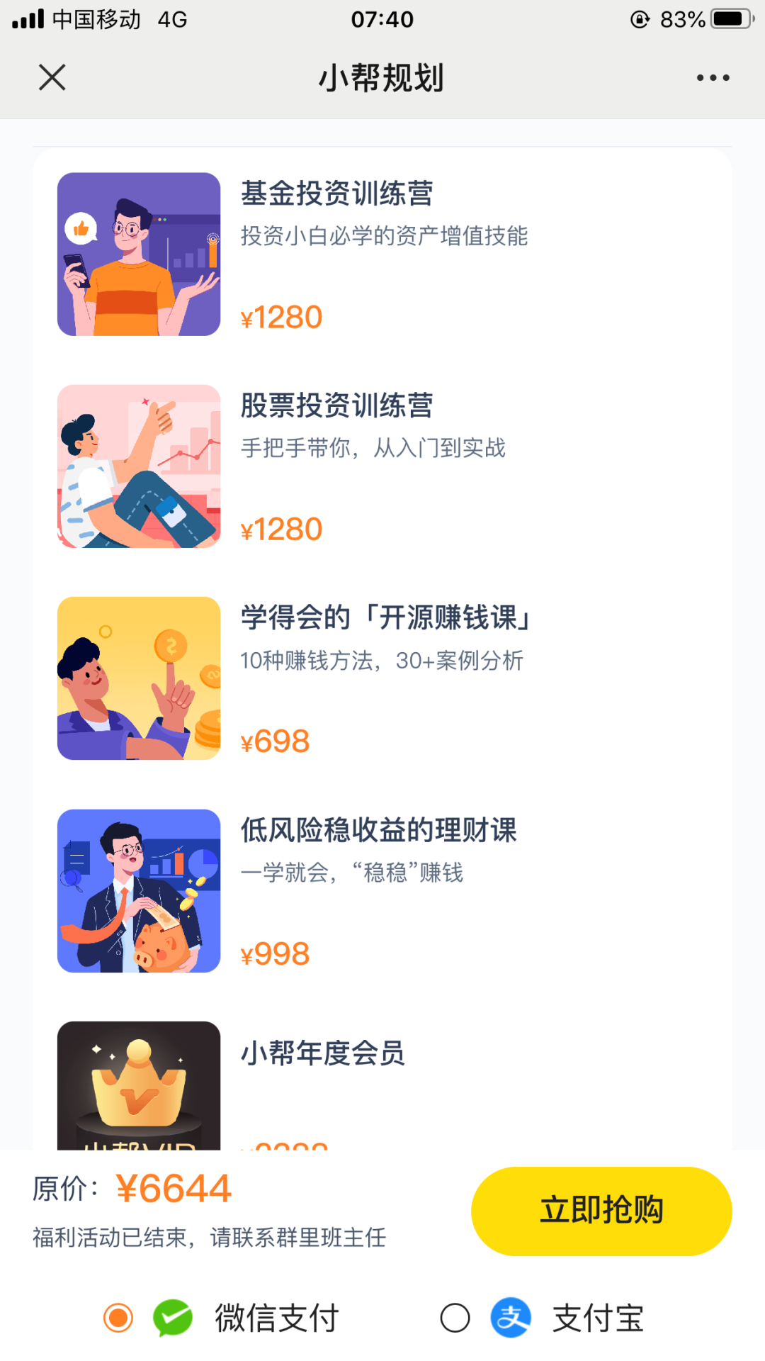 会员、理财训练营、保险训练营...... 打包一起买的话6644元只需要2828元,单个买基本没什么优惠。