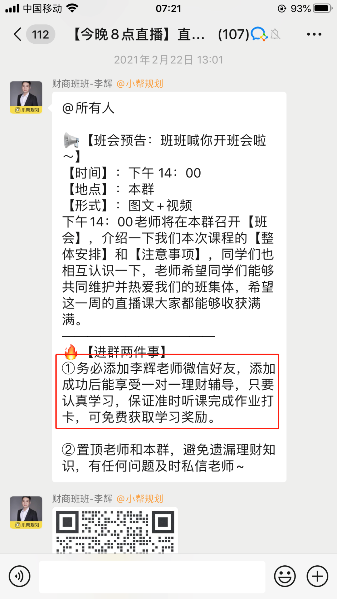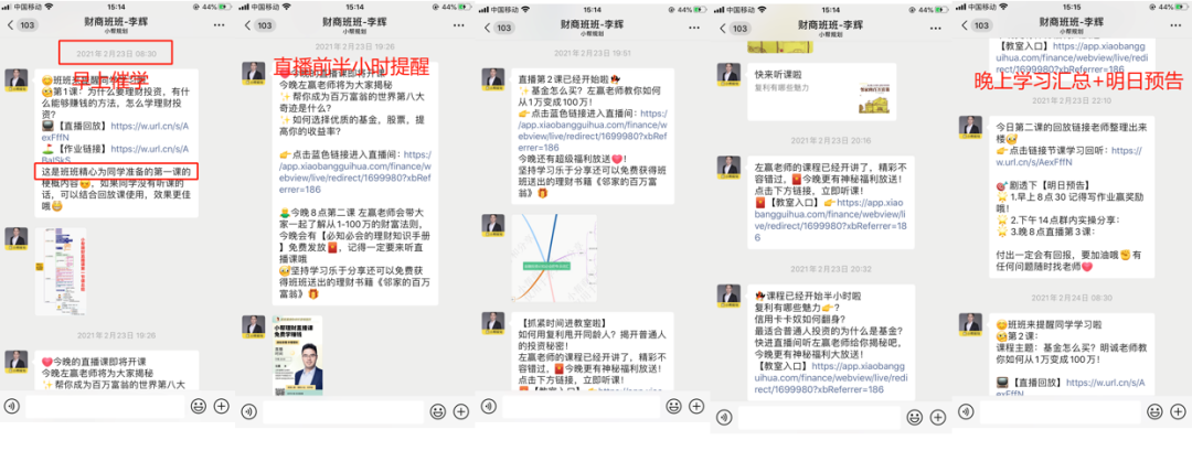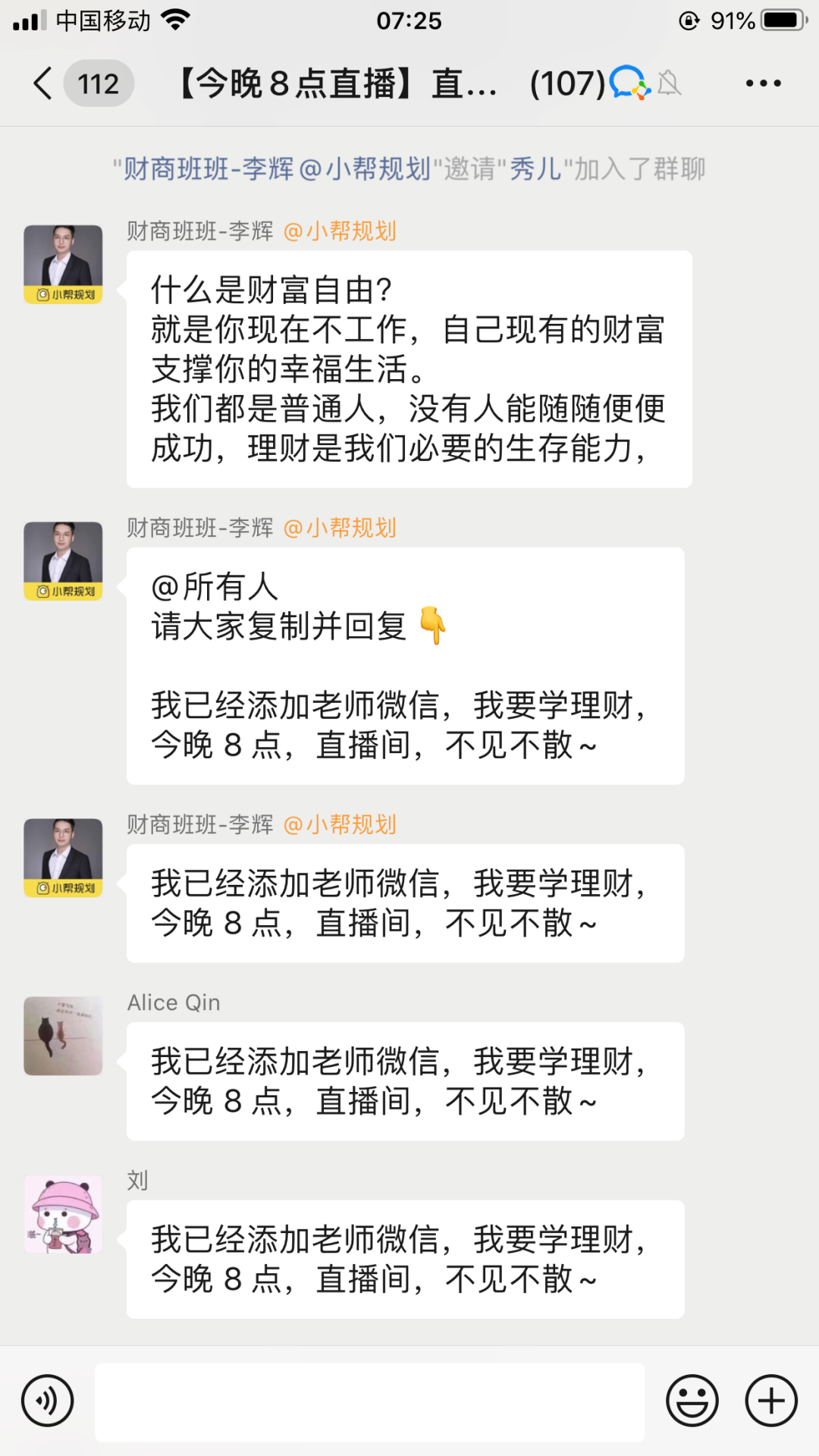 班会结束后让大家复制一段话:我已经添加老师微信,我要学理财,今晚 8 点,直播间,不见不散~