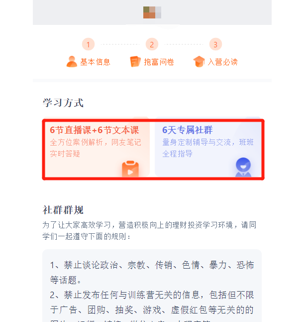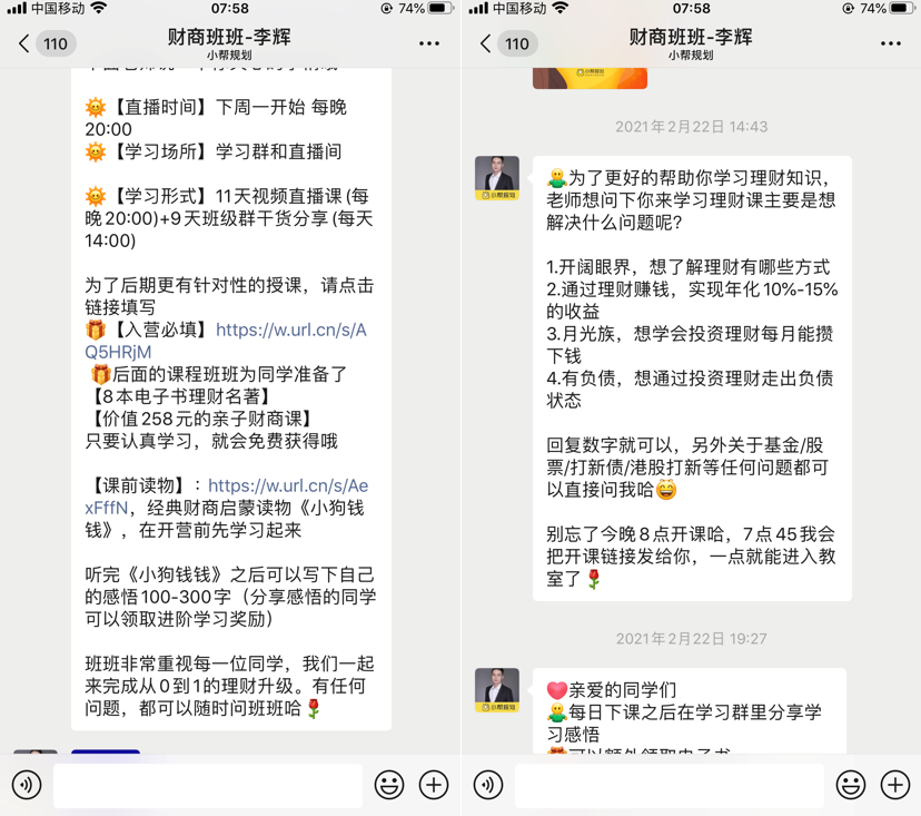 需求挖掘:入营问卷里会问到,年龄、学历、工作情况、是否婚育、理财目的、理财基础等。班班私聊沟通确认用户的情况,方便后续上课期间的追踪和跟进。