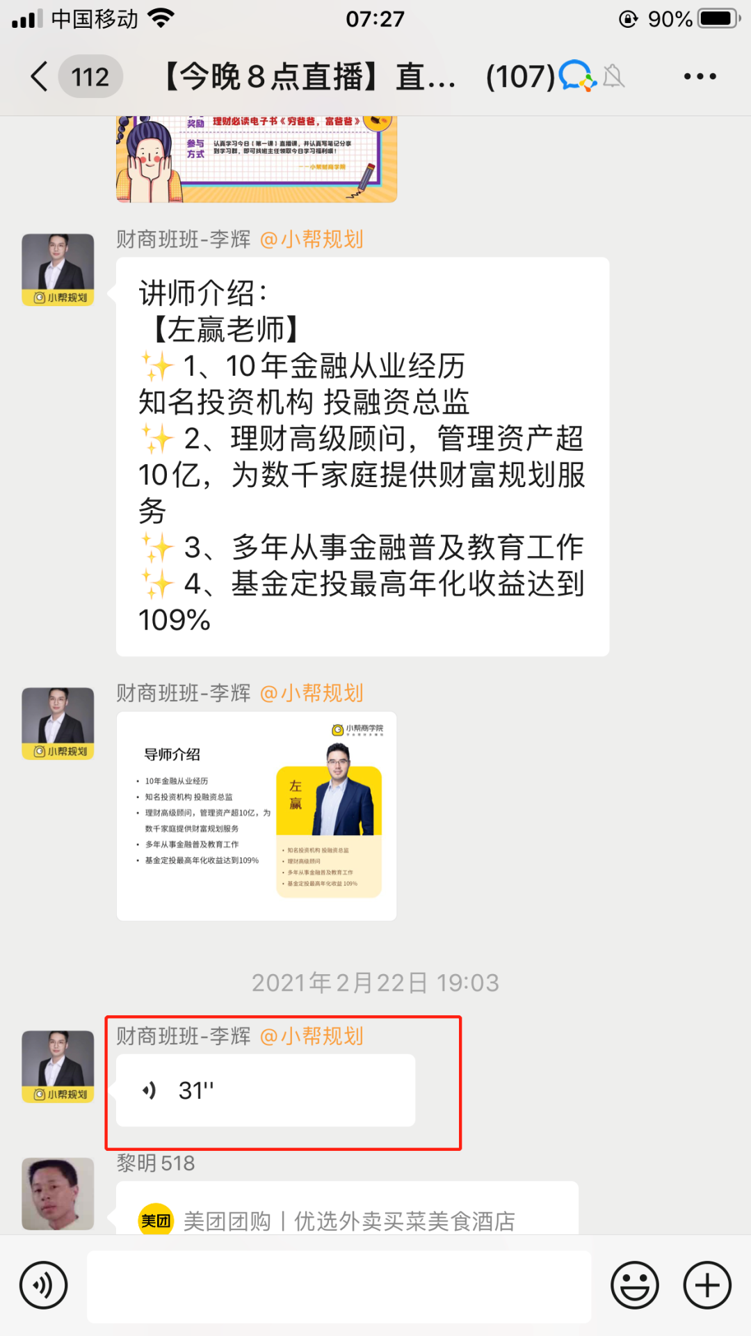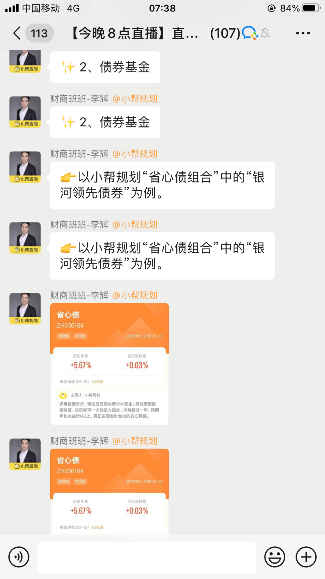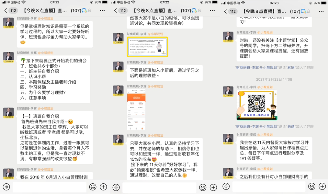 1.自我介绍时,详细讲了自己的经历,以前是体制内员工后来加入小帮来理财,赚了xxx钱,晒出自己的收益图。这种我觉得挺好的,打下自己的专业人设,同时也让用户觉得:我要是像班班一样好好学习,也能赚得盆满钵满。