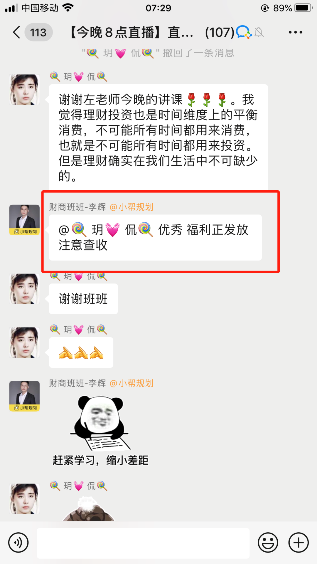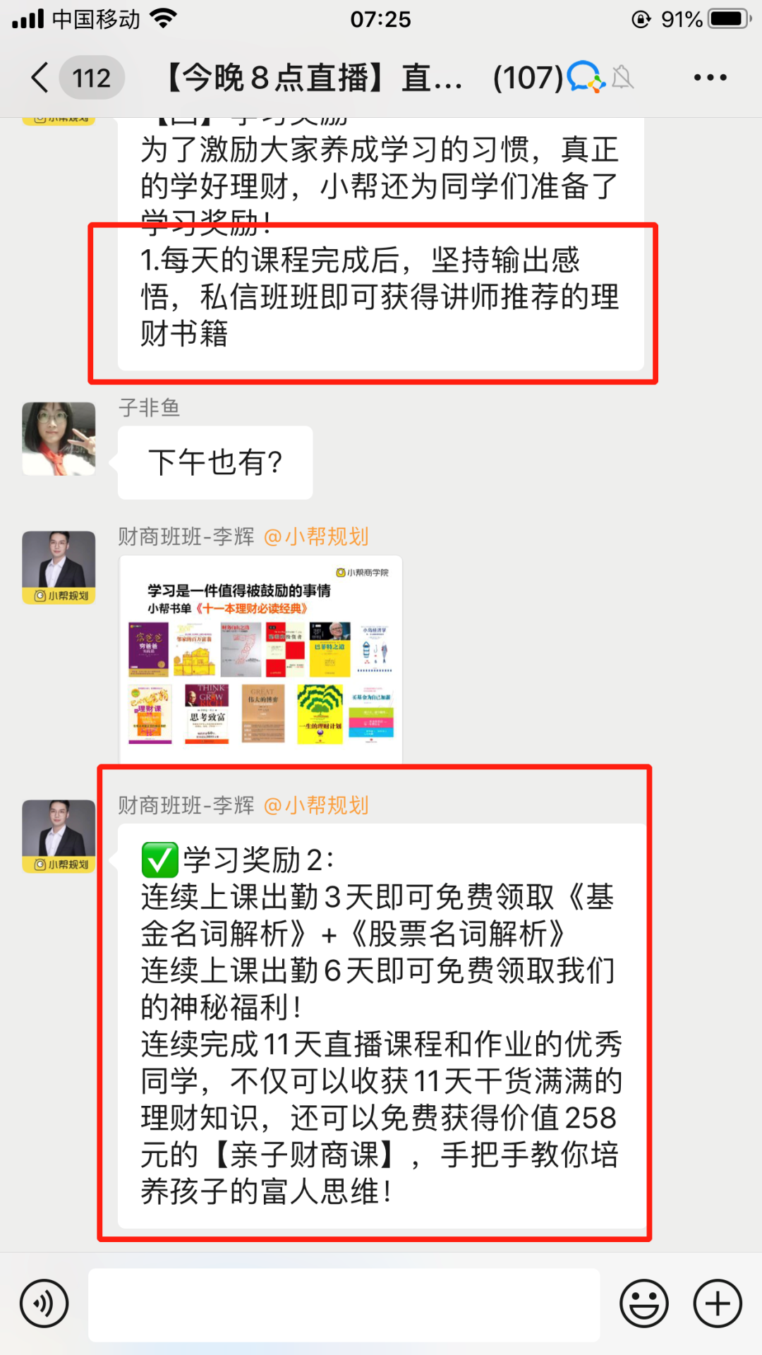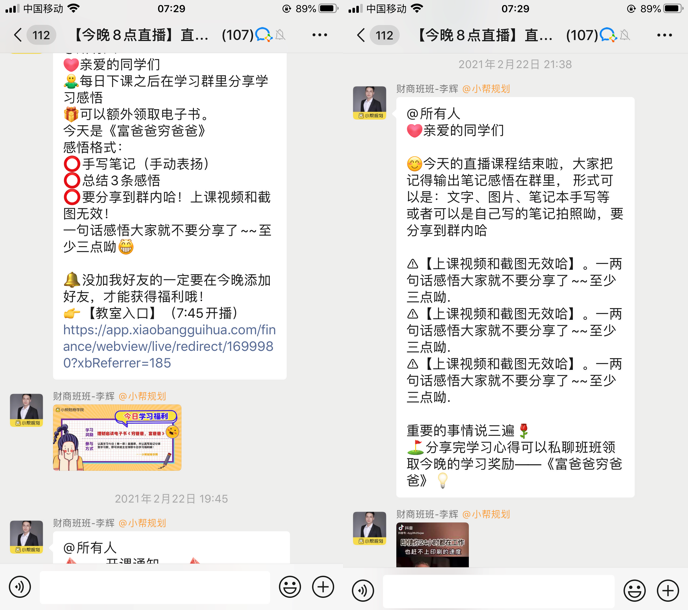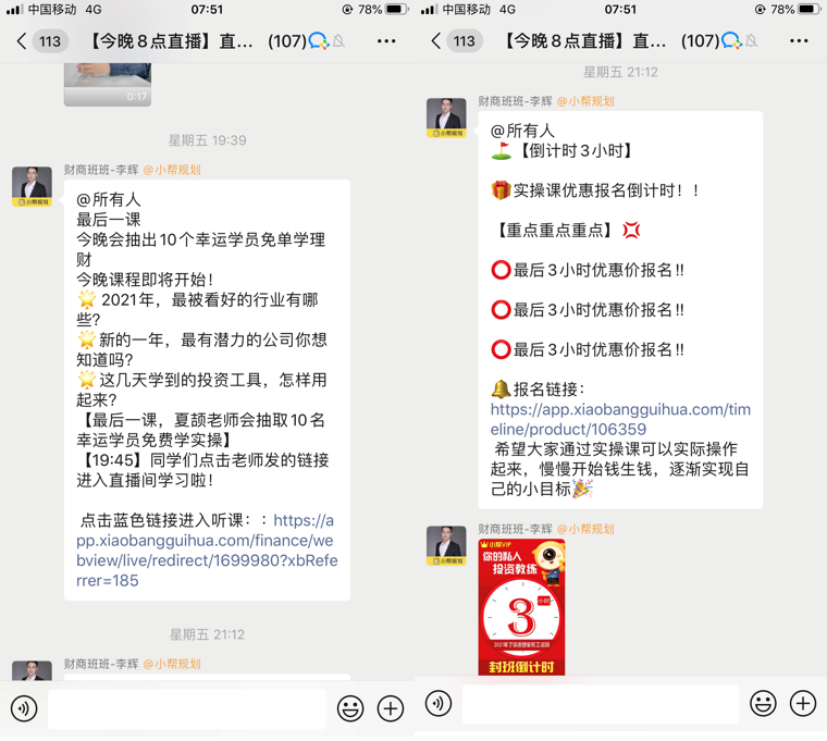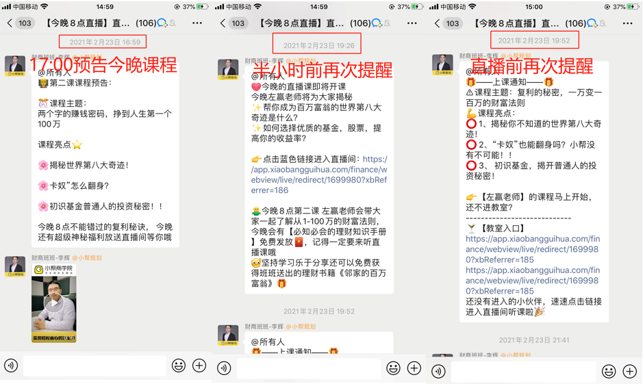 艾特到每一位用户,用户会觉得自己被看见。同时给课前读物,能让用户快速进入状态,避免遗漏这次学习。我觉得在开课前我们也可以做课前预习的动作,毕竟免费课或者低价课,用户真的不怎么放在心上,如果不能在一开始抓住他们,后续就有可能会流失。