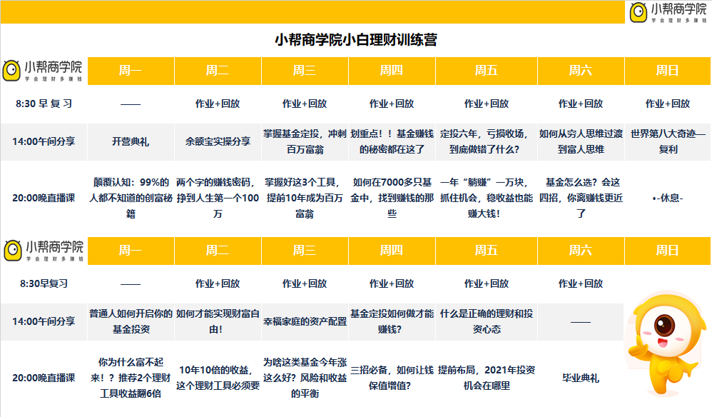 同学你好,这是你的第二天的作业,很开心能看到你的拆解案例,你拆解的小帮规划理财小白营,这也算是我们最近要上线的,可能是有业务相关性吧,所以看到你的一些想法就很兴奋,我之前也有拆解过小帮规划、长投微淼的训练营,就你拆解的作品我们交流一下看法
