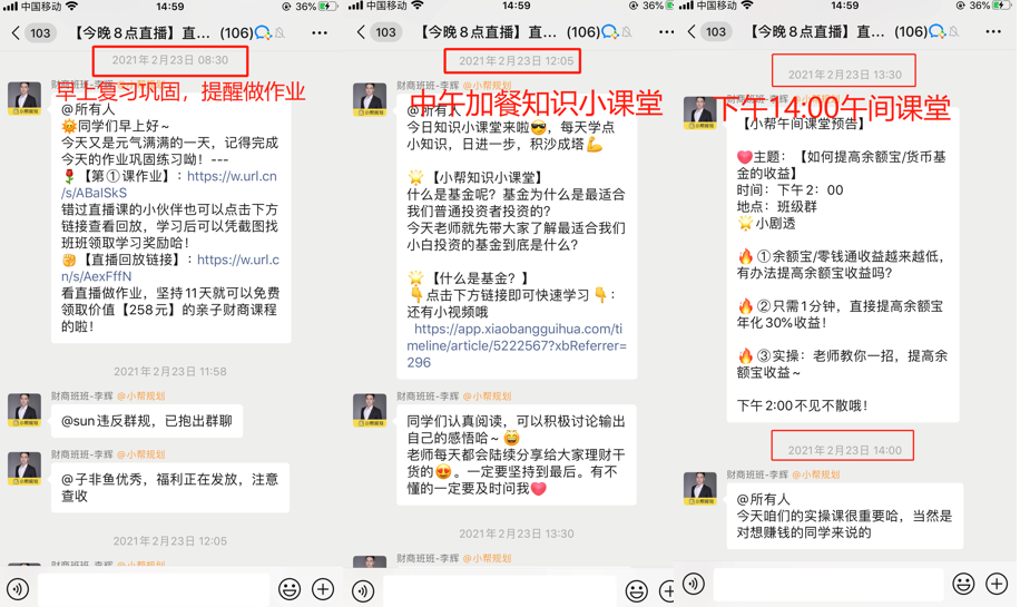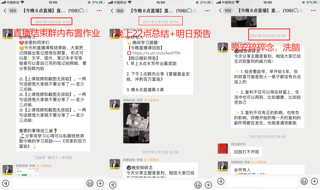 3.开营后的口号:我已经添加老师微信,我要学理财,今晚 8 点,直播间,不见不散~