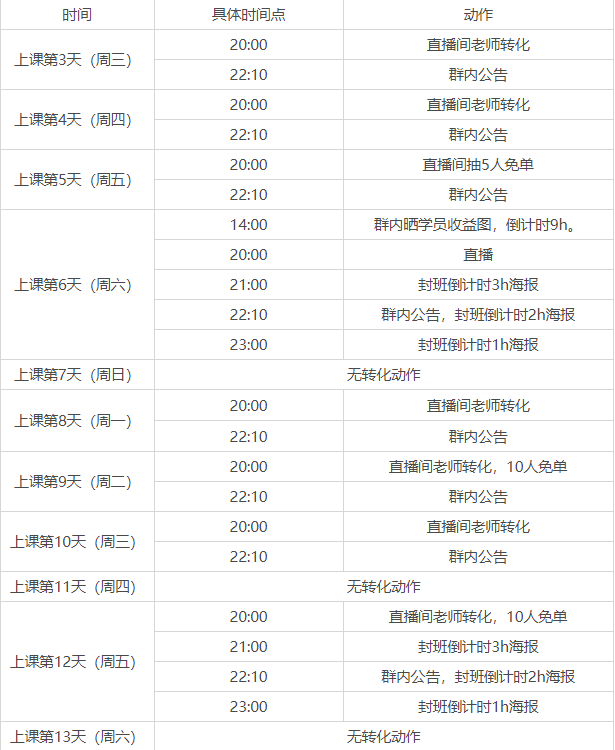 另外就是明确销售诉求,根据自己的sku体系,总结出产品服务与优势,列出优先级;还有很重要的一点就是解决用户信任,在训练营中需要立出一位可以背书的人(不是品牌),通过精细化的服务解决用户问题;最后就是常见的社群氛围的打造,包括从众心理、话题性、情绪互动、限时截杀等