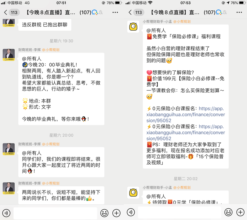 这个课群没解散,后续会引导到其他小白营 如理财小白营啊,或者是让用户参加一些裂变活动等等。