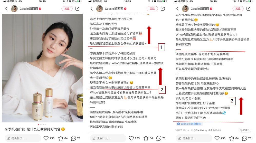 展示价值当中包含信任,比如图中笔记文案②部分,写着"这个品牌从我高中时期就是一个家喻户晓的韩国品牌,一直想尝试。毕竟是不老女神李英爱推荐的。"这里说明品牌,但这篇笔记是走报备的,所以广告会明显。
