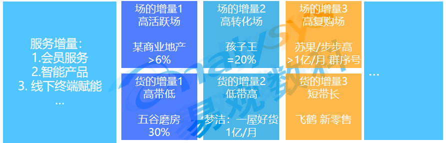 这也就意味着,未来,亲密业务还有着非常大的发展空间。我们预计亲密业务在未来至少会占比30%,因为它不仅有"服务增量","服务增量"会和线下实体业务及平台电商业务互相融合、赋能,例如,线下终端赋能等;更重要的是亲密业务还会创造更多"场的增量"以及"货的增量",产生更多低成本获客的可能性。
