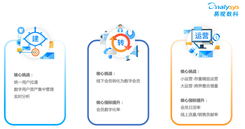 - 一建。是指前台后台的基础设施建设,前台需要商业地产企业尽快搭建和用户连接的线下触点,即自己的APP、小程序等;后台则可以通过易观方舟建立系统的智能分析、智能画像、智能运营平台;