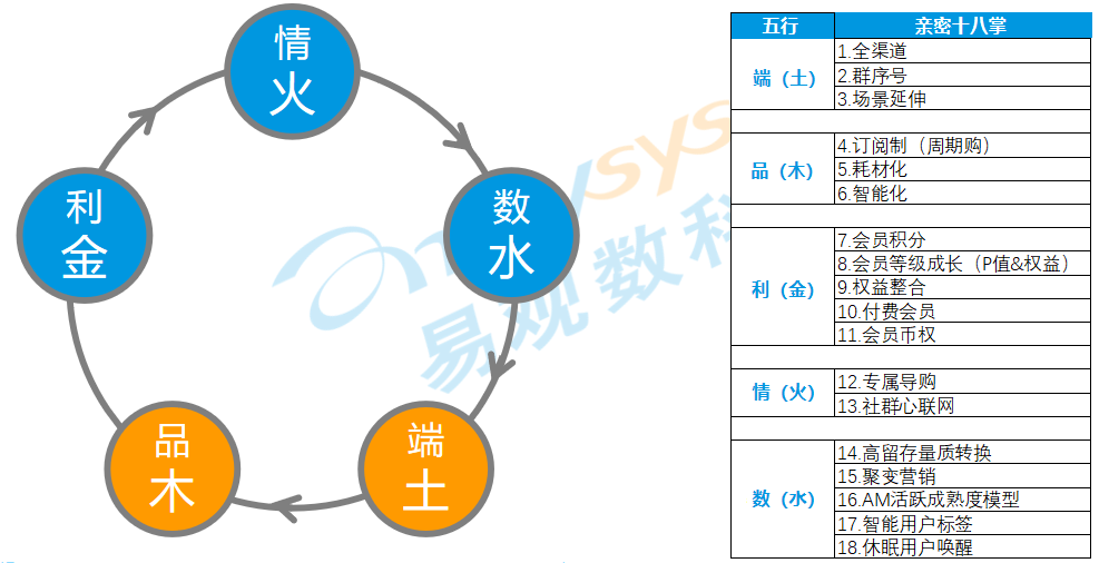 了解"一建二转三运营"是什么后,那么接下来具体的实施方法是什么呢?我们借助老祖宗的智慧,总结了亲密业务运营的"五行十八掌"。