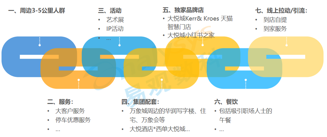 3. 活动。活动包括艺术展和各种自创的联合IP类活动等。像大悦城、万象城等是这方面的典范,大悦城已经变成了青年文化地标,深受年轻人的喜爱;