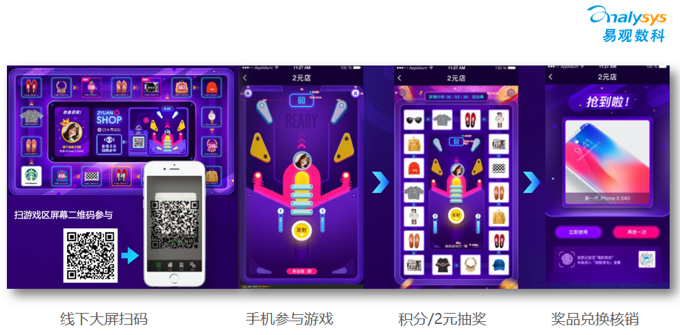 最近商业地产出现了一个爆款产品——"二元闪店"。"二元闪店"基本放置在商场中最显眼的位置,用大屏呈现。用户通过线下大屏扫码,然后手机参与游戏,就可以用积分或者2元钱抽奖,获得的奖品即可在商场内兑换核销。这款产品是我们的合作伙伴脸脸科技为客户开发的,商业地产A通过此款产品,优惠券的到店核销率能接近30%。