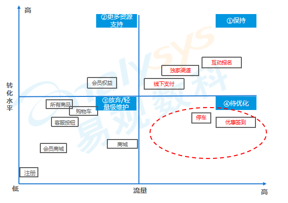 这五大场景的从用户至接触到转化到整体效果如何,应该如何提升?我们可以通过易观方舟对线上产品的流量入口进行转化诊断,然后通过波士顿矩阵发现问题,对转化异常的节点进行优化。
