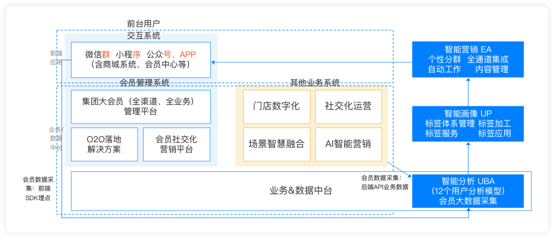- 水,是指用户数据。例如,用户标签数据和会员数据。数据驱动是商业地产企业相对最欠缺也最有边际效应的一个点,数据必须要打通,要像水一样流动起来才具有价值,而这一点是目前很多商业地产企业都不具备的。