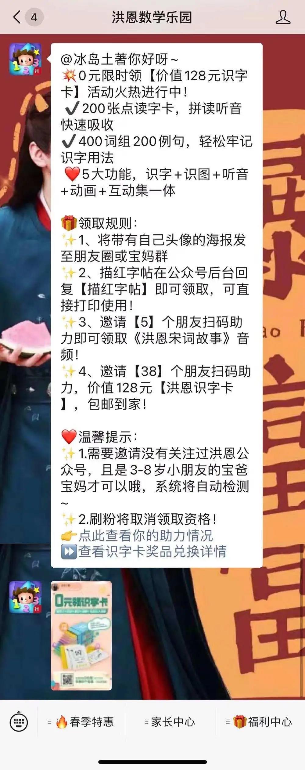 扫描"0元领识字卡"海报二维码——洪恩数学乐园公众号——将海报发至朋友圈或者宝妈群——邀请5位好友扫码助力可领取《洪恩宋词故事》音频/邀请38位好友扫码助力可领取价值128元【洪恩识字卡】,包邮到家