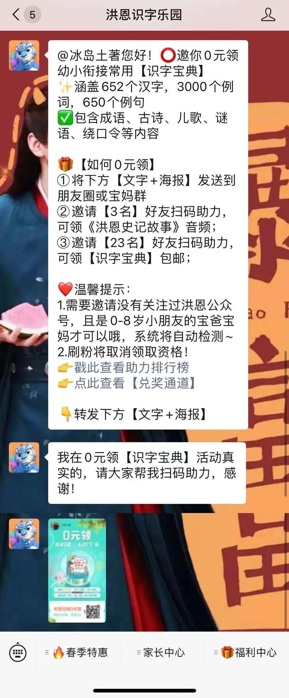 扫描"0元领我的第一本识字书"海报二维码——关注洪恩识字乐园公众号——将【文字+海报】分享到朋友圈或者宝妈群——3位好友扫码助力,可领《洪恩史记故事》音频/23位好友扫码助力,可领【识字宝典】包邮