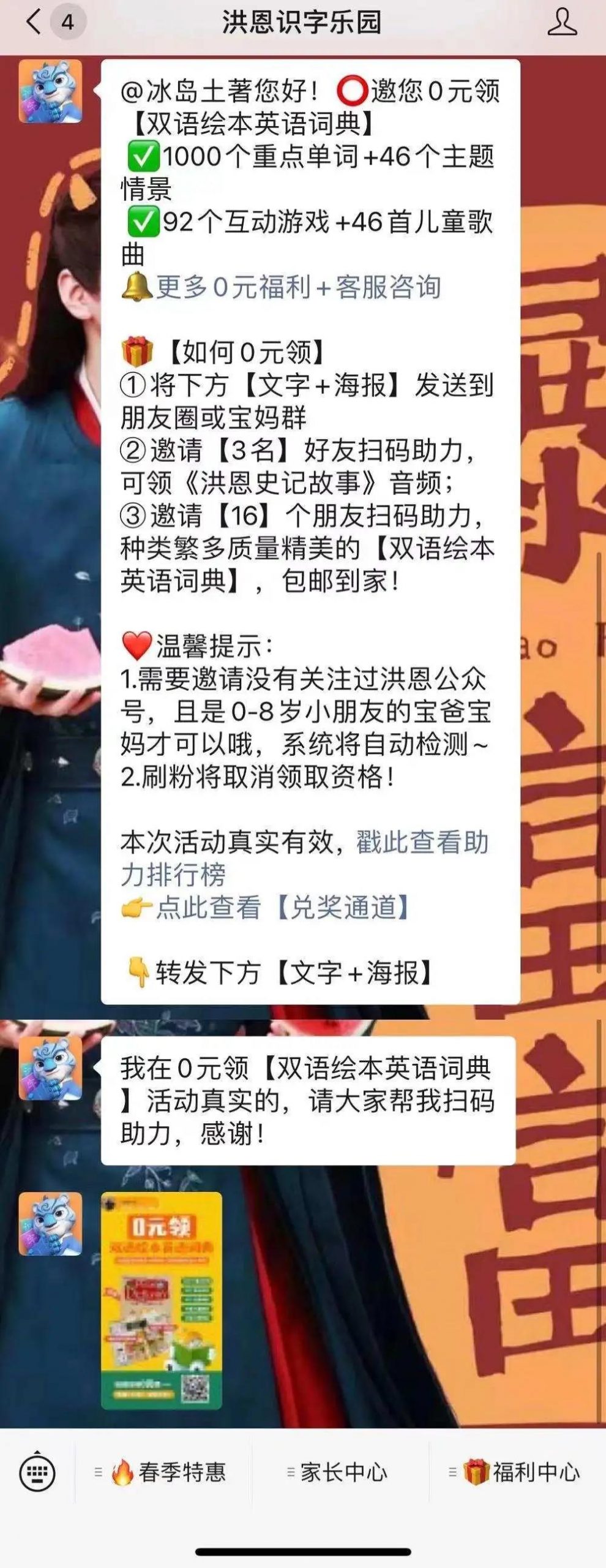 被邀请扫海报二维码是引导到洪恩英语乐园微信公众号