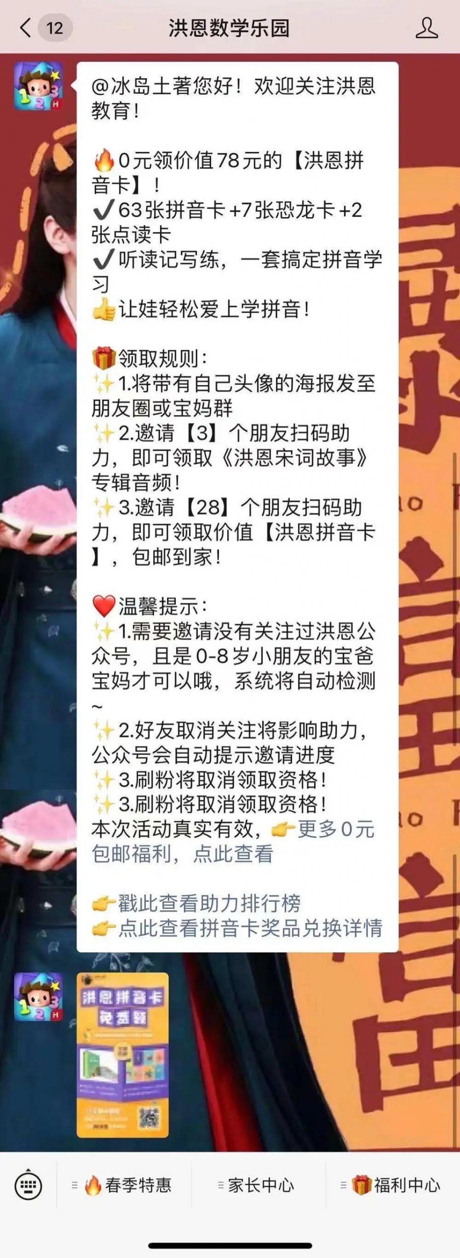 扫"0元领取洪恩拼音卡"海报二维码——引导关注洪恩数学乐园微信公众号——将海报分享到朋友圈或宝妈群——邀请3位好友扫码助力可得《洪恩宋词故事》专辑音频/邀请28位好友扫码助力,可领取【洪恩拼音卡】