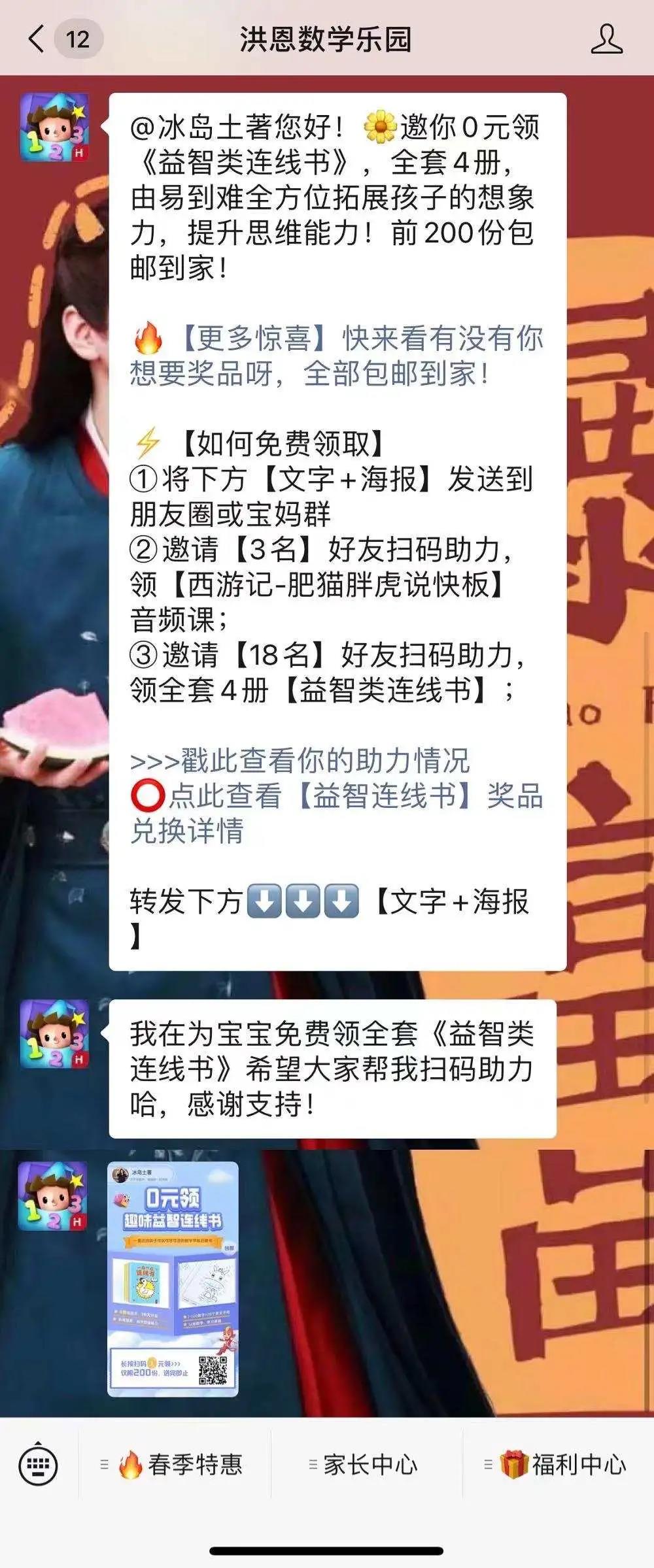 扫码"0元领趣味益智连线书"海报二维码——引导关注洪恩数学乐园微信公众号——将【文字+海报】分享到朋友圈或宝妈群——邀请3位好友扫码助力可得【西游记-肥猫胖成虎说快板】音频课/邀请18位好友扫码助力可得【益智类连线书】