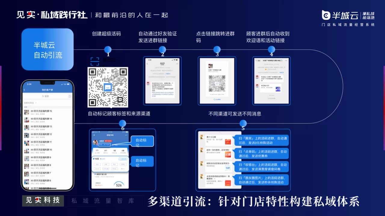针对线下门店这些困惑,半城云CEO黑墙提到了一个私域流量经营万能公式:多渠道引流--复购式经营--周期性爆款--裂变式传播--持续的数据洞察。