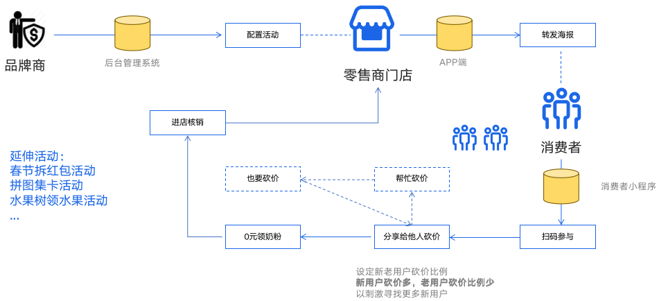 【案例六:老带新裂变】品牌商(或者运营服务商)在系统配置完成后,门店点击参加活动即可分享一个带参数的二维码,消费者可以通过邀请新用户来为自己砍价来使得自己购买商品获得一定的优惠。