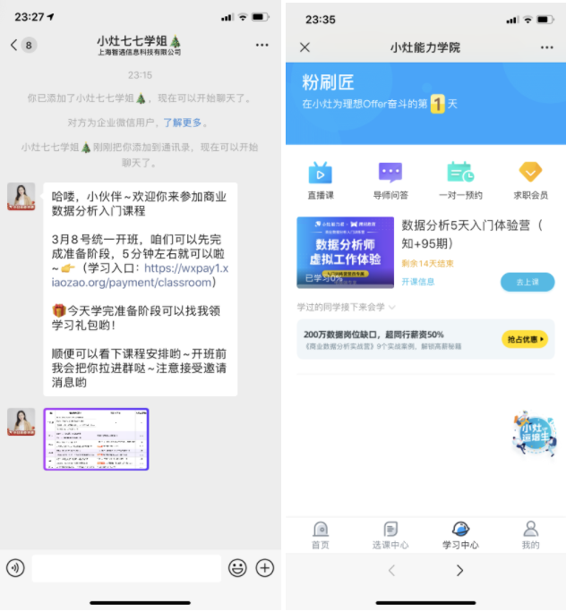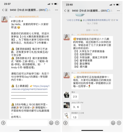 (2)开营仪式:班主任自我介绍、平台介绍、课程介绍、导师介绍、现状分析及数据发展前景、课程福利预告、学习安排、打卡方式及群规则。