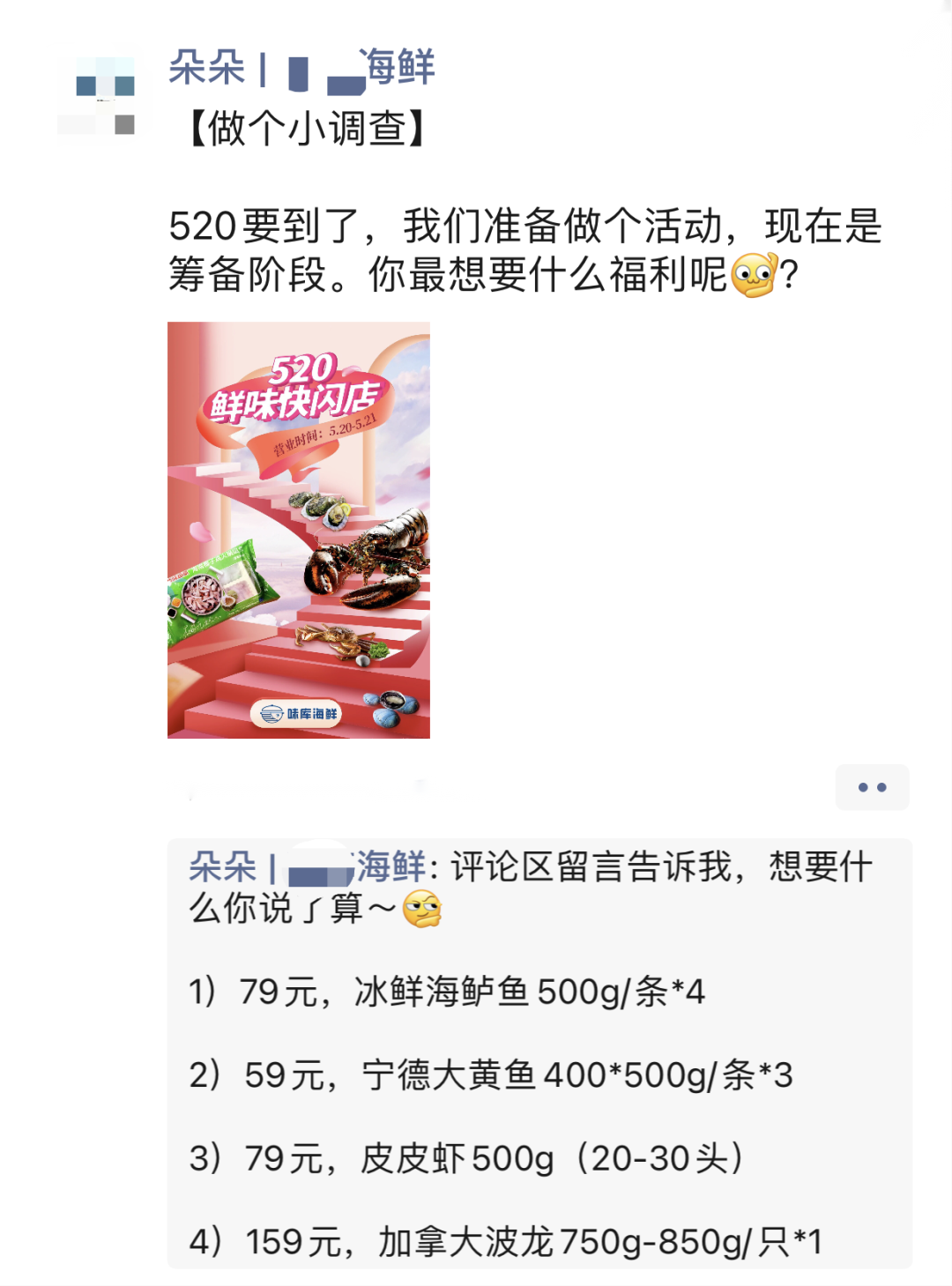在快闪群准备阶段,可以先在朋友圈内发起一个调查,了解大家想要什么活动权益,想要什么产品打折,在评论区留言,呼声最高的选项将满足于大家。
