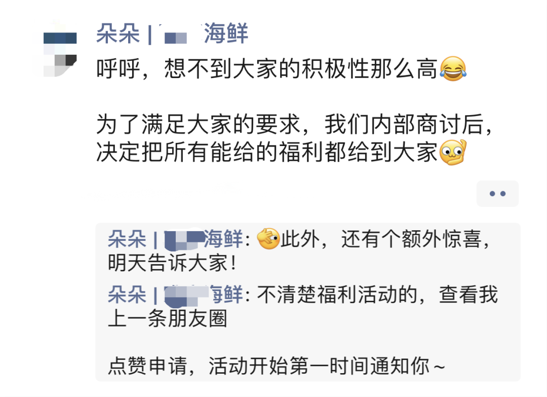 这也要求我们在前期发朋友圈剧本预热时,要尽可能多引导用户点赞、评论。同时,用户有过互动行为,就默认了他对活动感兴趣,是精准用户,可以进行1对1私聊邀约进群。