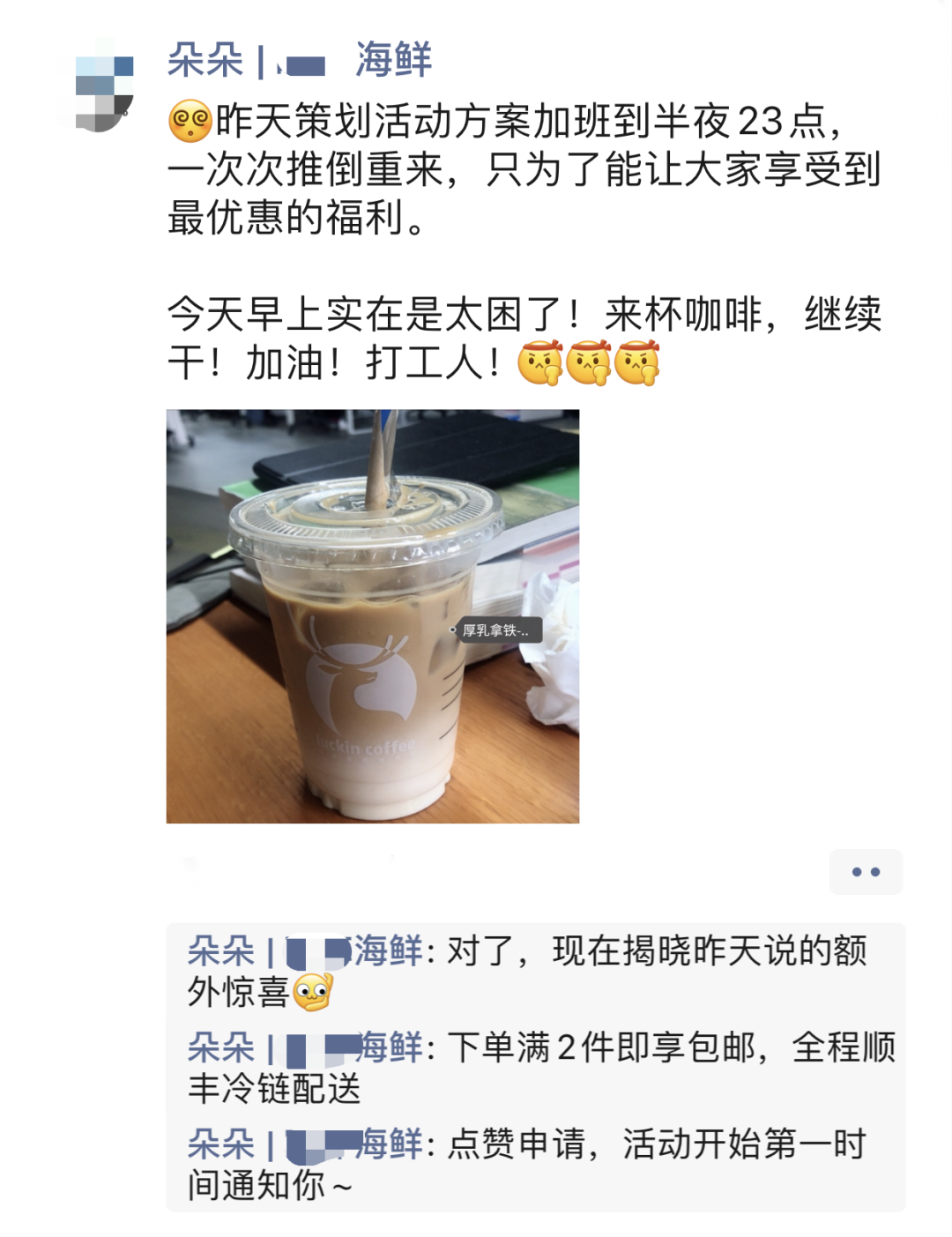 比如,可以发:为了能让大家享受最优惠的福利,加班策划活动方案;为了保证货品准备送达,挑选对比多家快递公司;为了将最好的产品交到用户手里,团队熬夜检查、制作产品……
