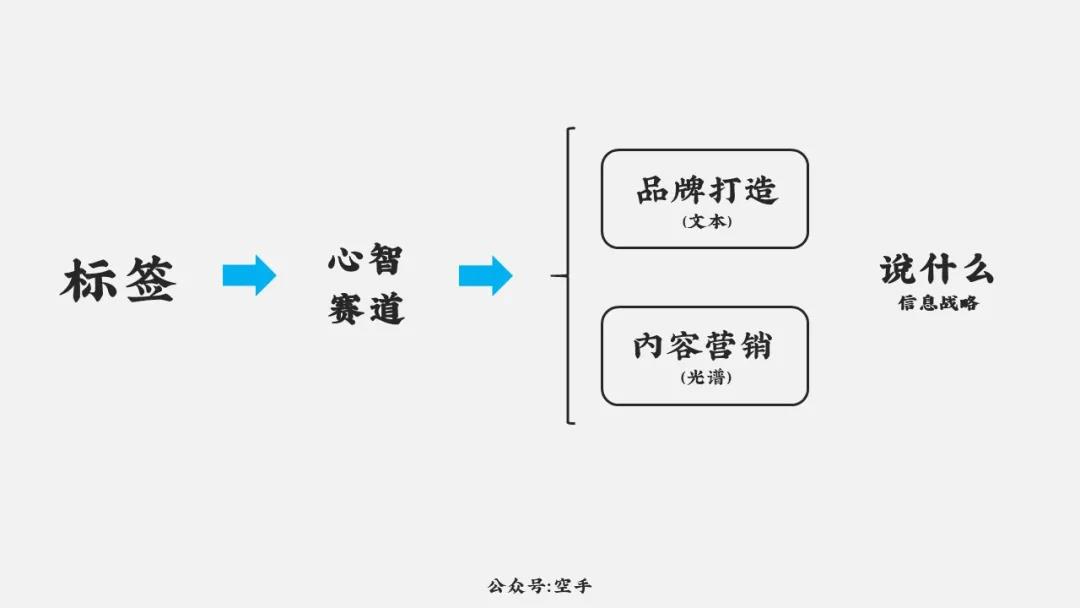 企业通过品牌标签的设计找到自己的心智赛道,然后通过品牌文本和内容光谱对标签进行展开演绎。