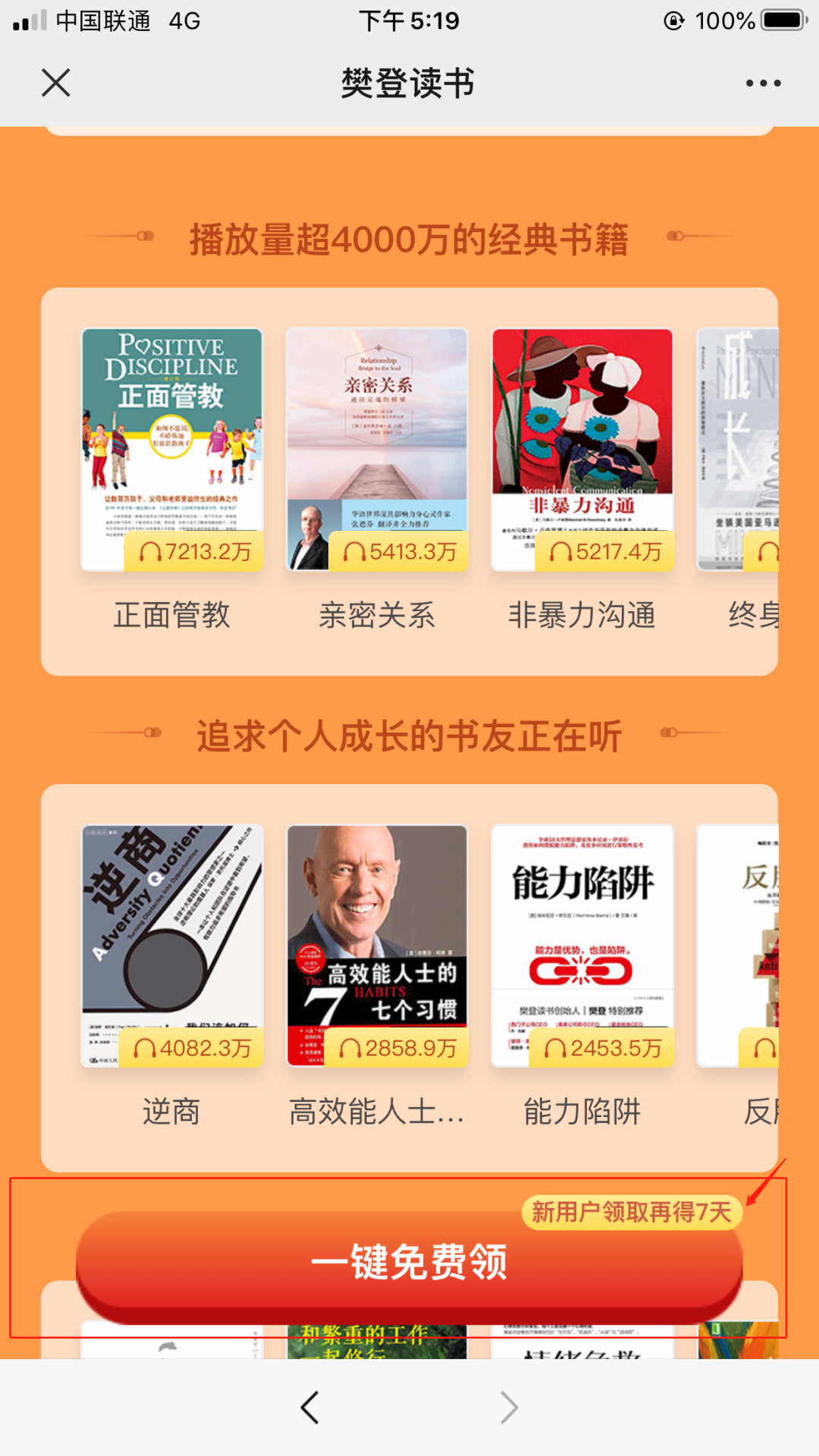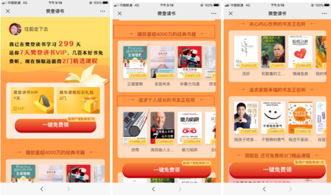 4、整片拆解基本上很多点都拆解到位了,但是缺点就是还不够深入细致,虽然阶梯式奖励确实已经很多活动用过了,但是还可以更深入的拆解,从活动诱饵看VIP会员、课程,几百本书免费听,整体包装起来价值感还是很高的,但是成本几乎为0,唯一的成本就是阶梯式奖励送的礼品,奖品的选取也是跟产品的调性用户的需求符合