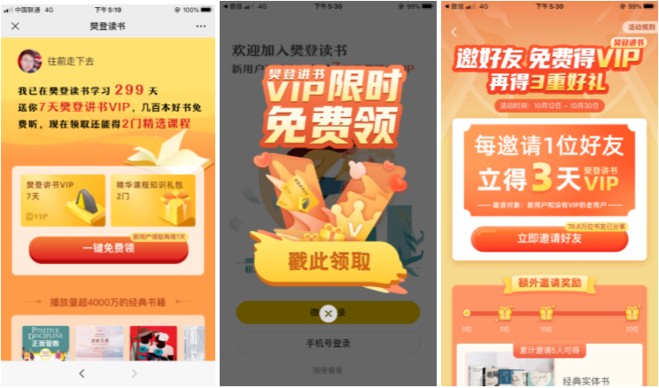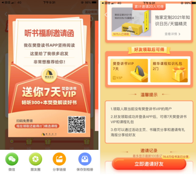 这个问题要从活动目标开始分析,这个活动的目标用户是非VIP用户,主要目的是让更多用户体验樊登读书的vip福利养成习惯从而转化普通用户为vip用户,并不是拉新,邀请新用户并没有额外的福利,并且邀请用户福利是vip的时间,所以对于已经是VIP用户来说意义并不大