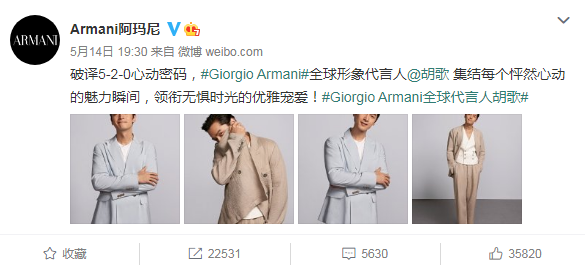 比如胡歌是阿玛尼的全球形象代言人,陈伟霆是玛莎拉蒂的亚太区代言人,蔡依林是宝格丽的大中华区代言人。