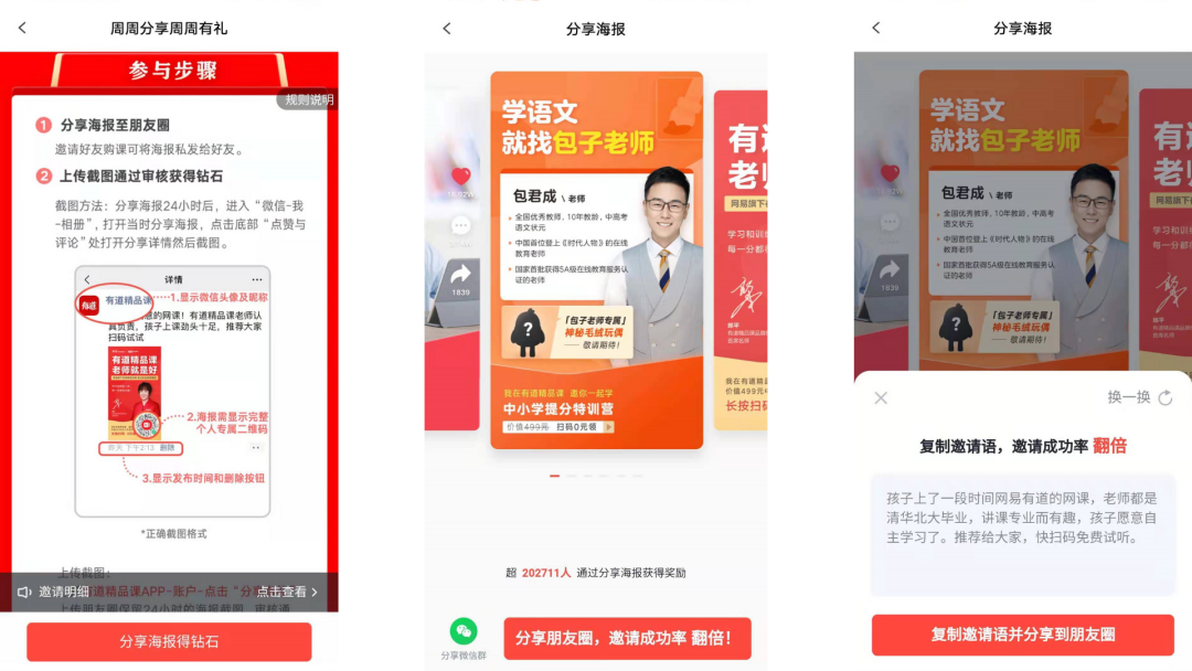 有道精品课在邀请好友这个动作上设计很多巧思,便于用户主动邀请好友,但在邀请海报上思路仍然偏向前端导流。