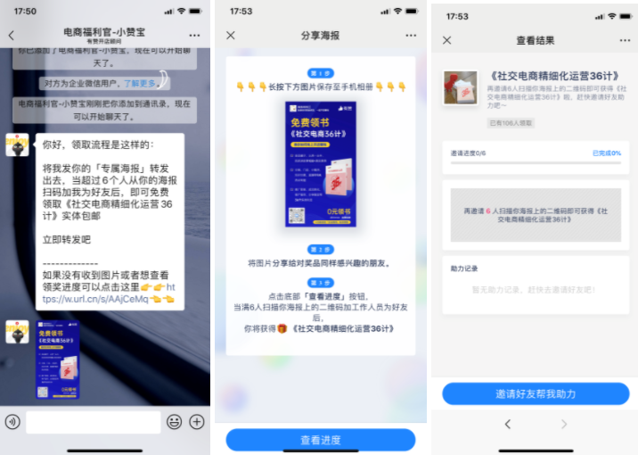 因为领取专属海报和查看进度是同一个链接,用户需要【点开好友对话框】-【找到链接】-【点击查看进度】,才能够看到自己的助力情况,比以往的操作要多了一个步骤;
