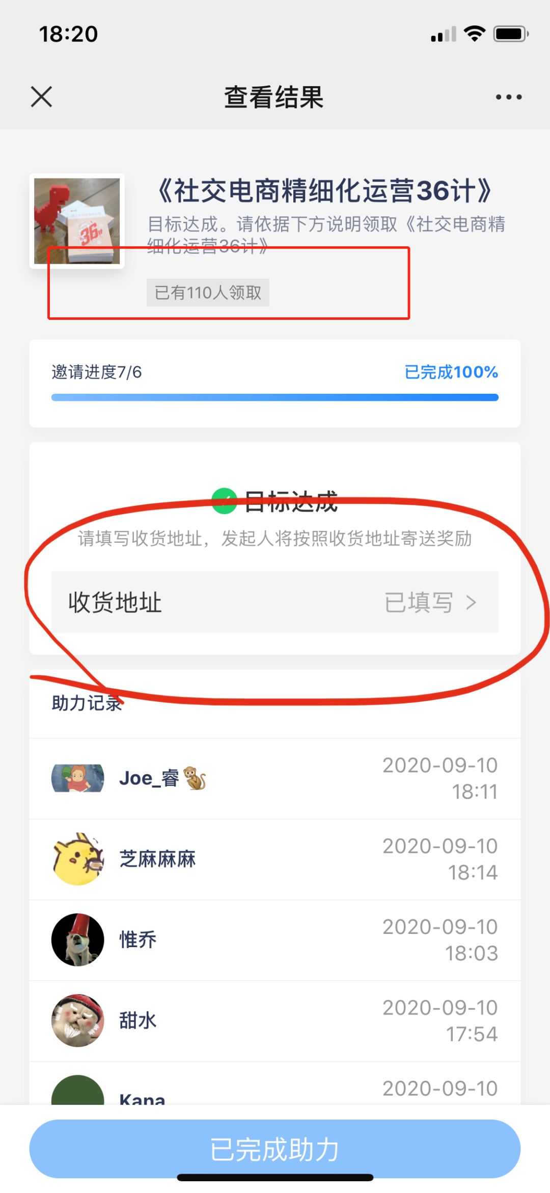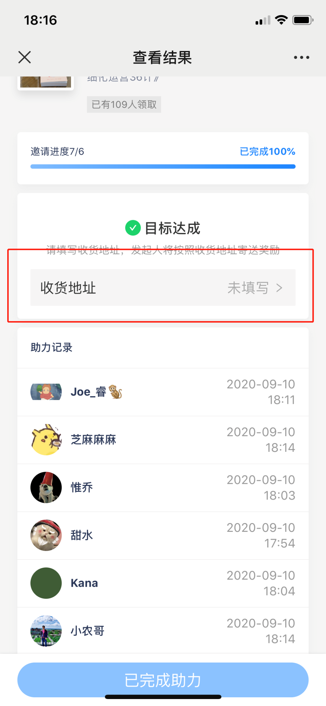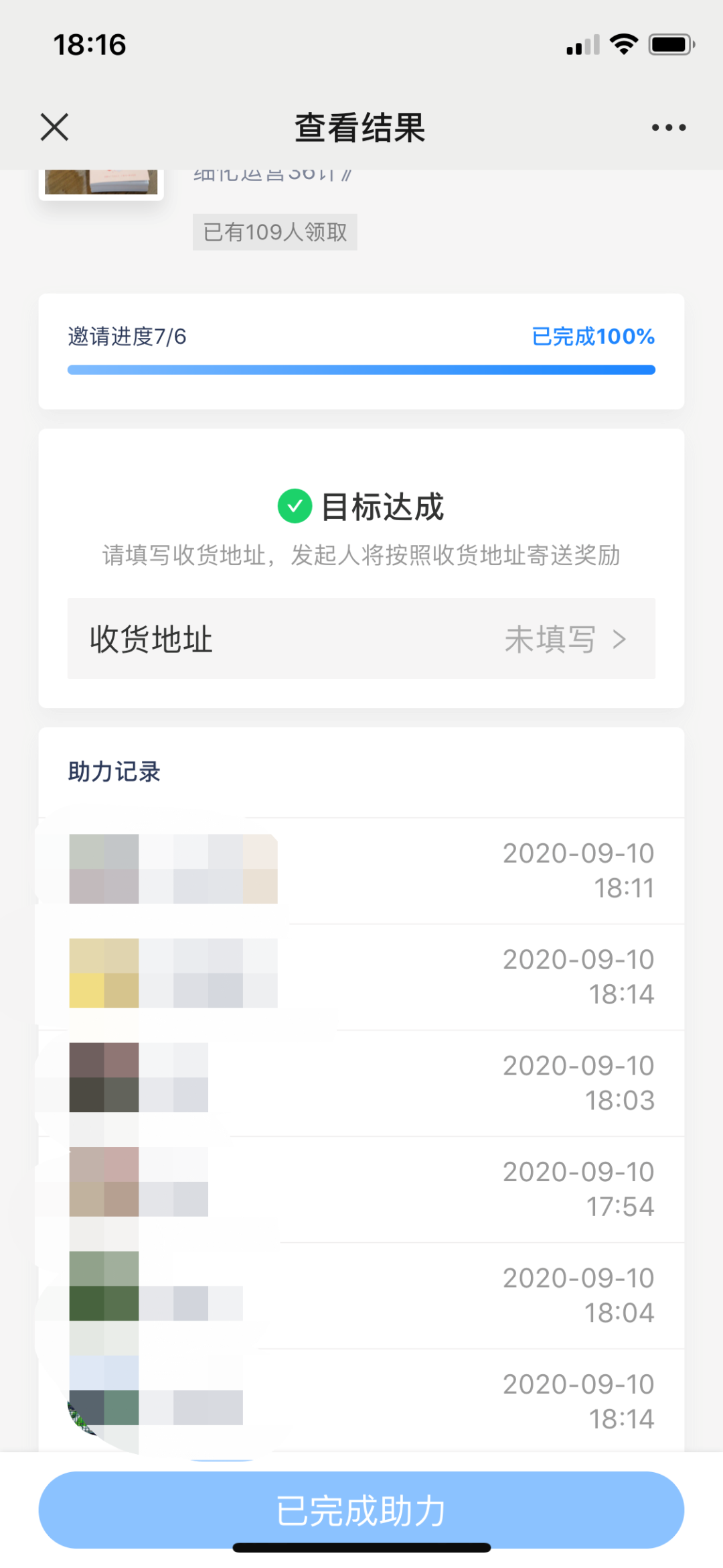 同样的,在助力完成后并没有提醒已经完成,不太清楚是不是因为是企业微信号不是服务号所以不支持此类功能,但用户体验不是很好;