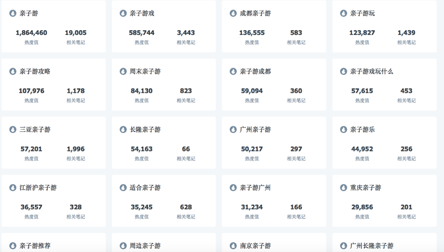 先看小红书关键词的数据热度,在下图亲子旅游相关的关键词热度,"亲子游"的热度最高,其次就是"亲子游戏",然后就是"成都亲子游"。