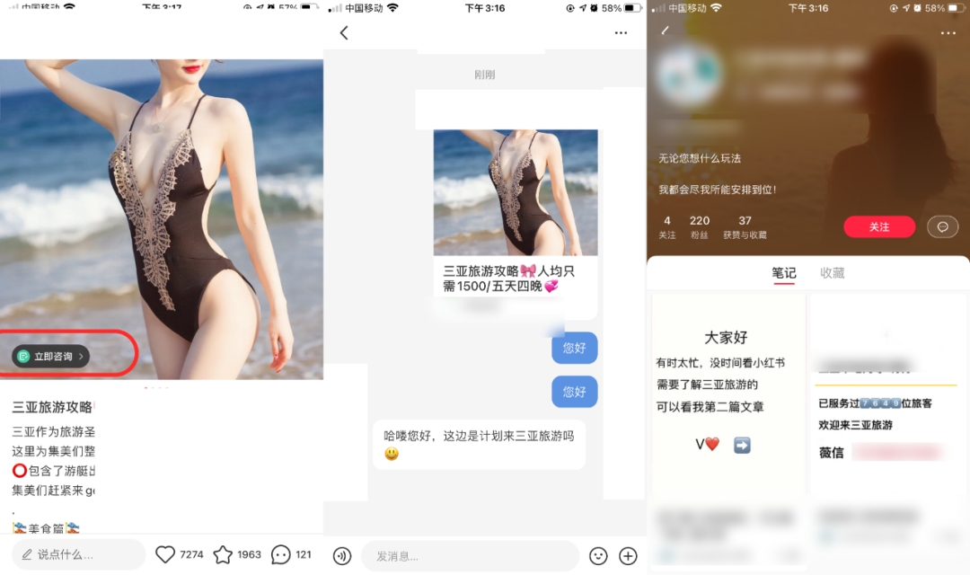 设置好企业号的介绍和头像等,下图第一张所示的立即咨询,是商家用来烧官方广告的笔记。当有人点击"立即咨询"就会自动回复。这些小技巧就不再多说。包括引流号的笔记封面设置,引流号的笔记不需要太多,但是发笔记要谨慎一些,如下图第三张所示,笔记封面有微信号码。通常来说,这种账号会比较危险。