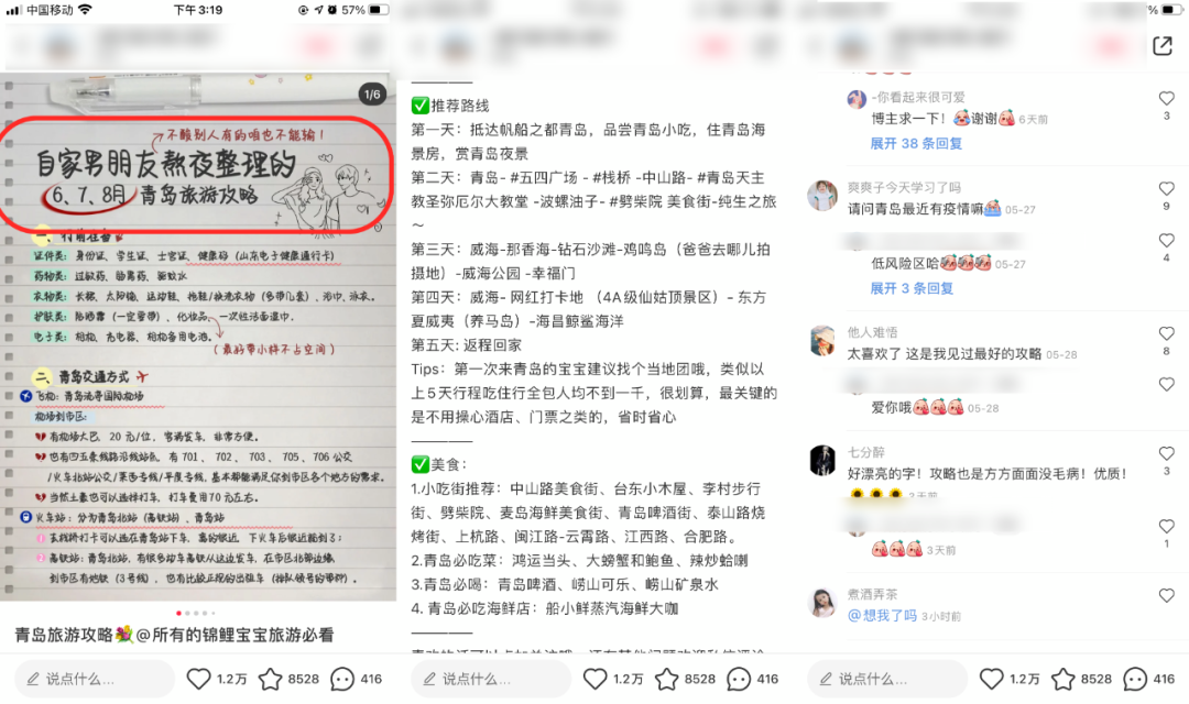 这时候的攻略类笔记,就起到关键性作用。因为被点赞、收藏的几率更高,容易触发小红书流量推荐机制。比如说下面图片的这篇笔记,写的是青岛旅游攻略,这种类型受欢迎的程度会比较高。详细的见下面的图片。